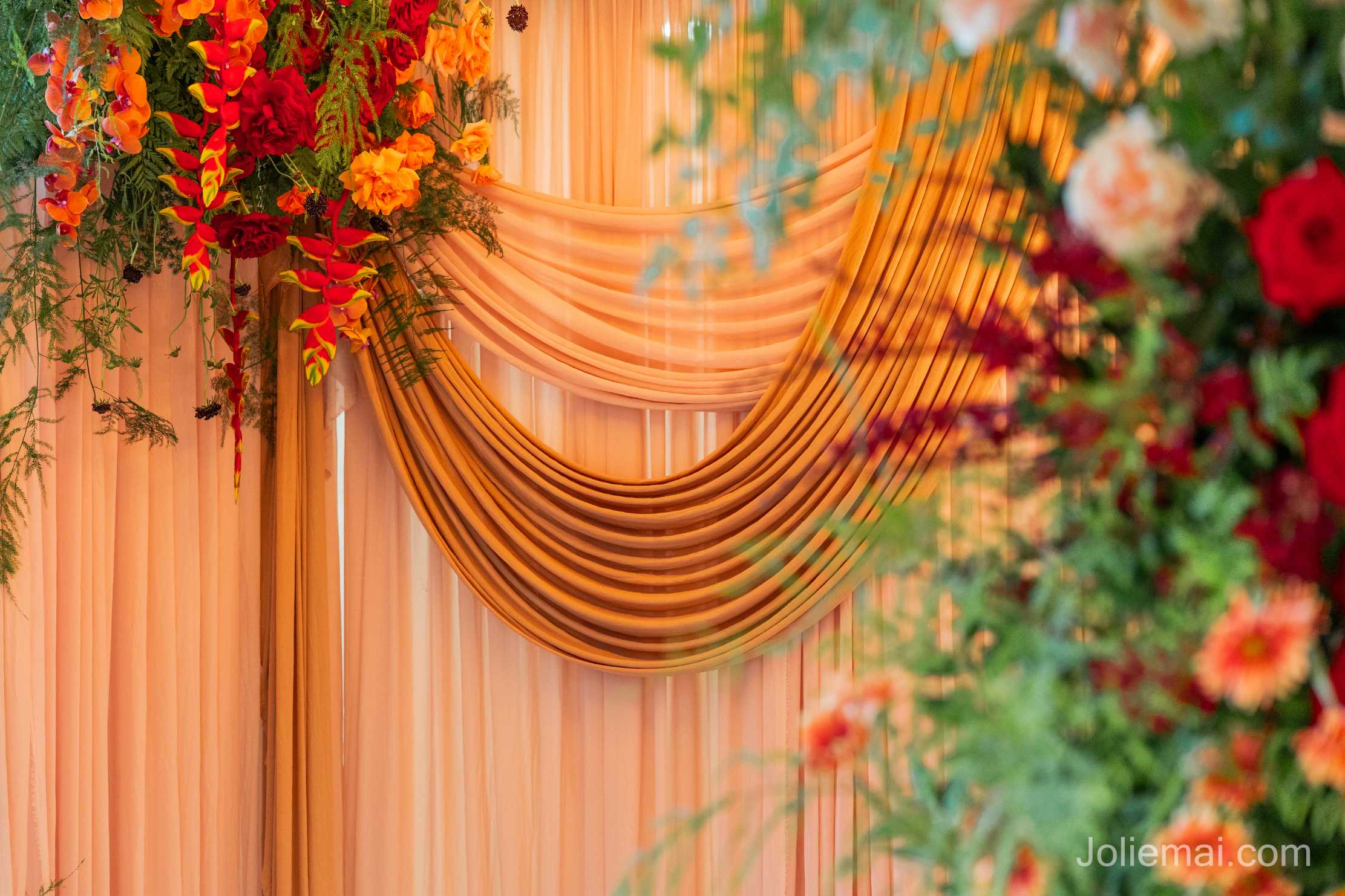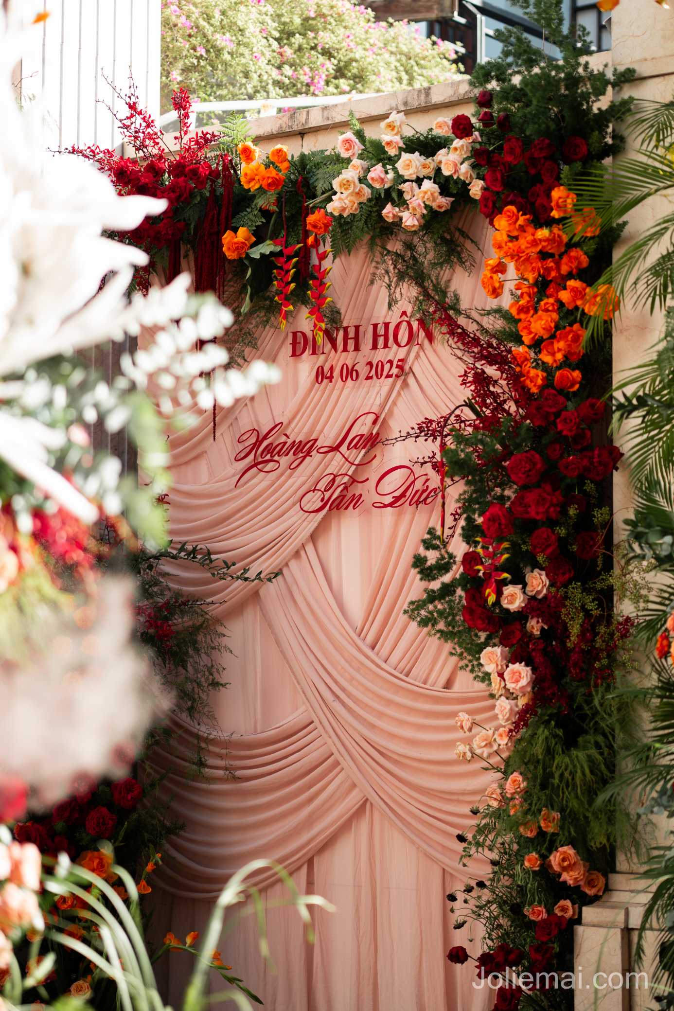 Phông nền (backdrop): thường đặt phía sau bàn thờ gia tiên, in tên cô dâu chú rể, ngày cưới.